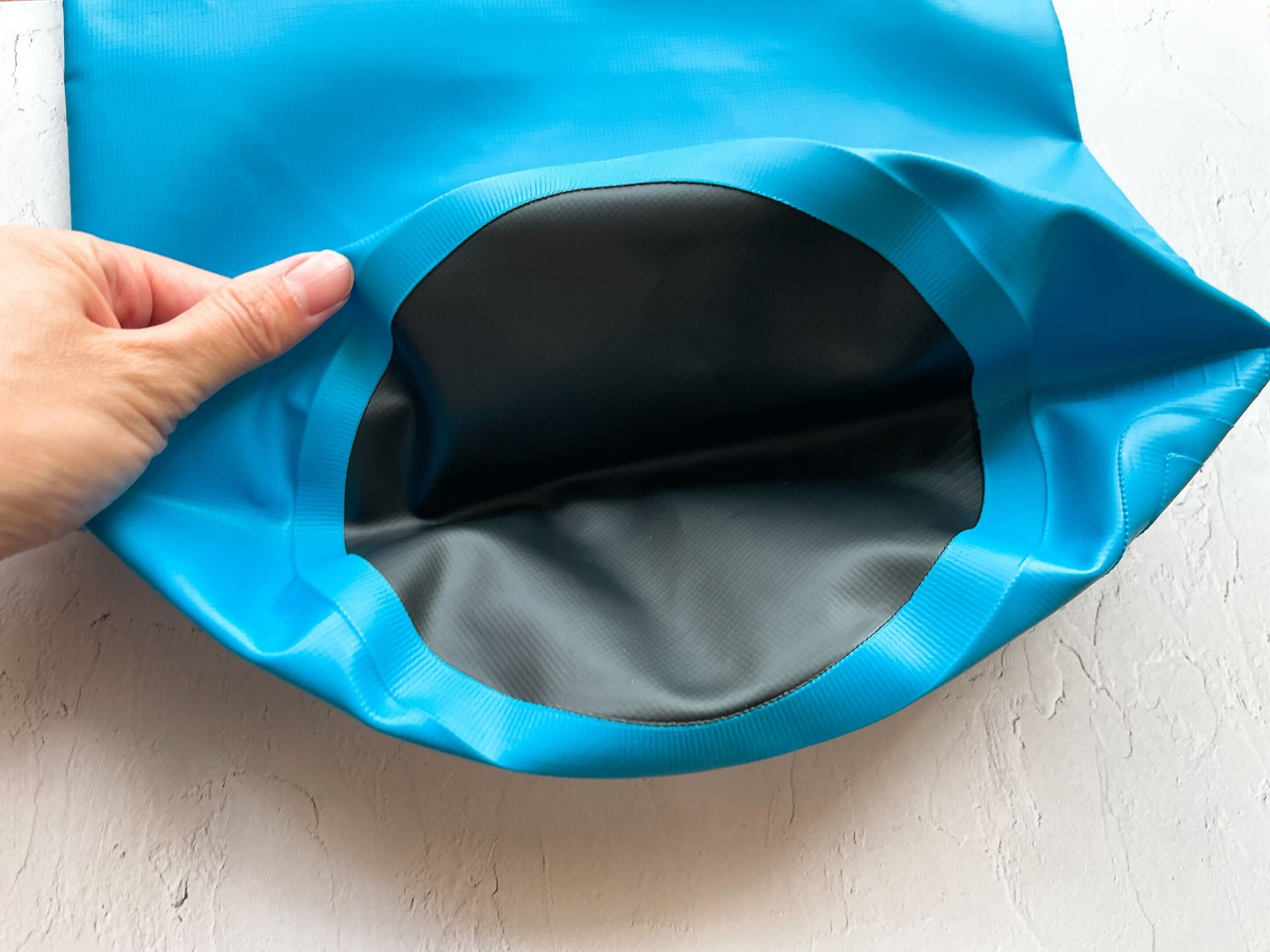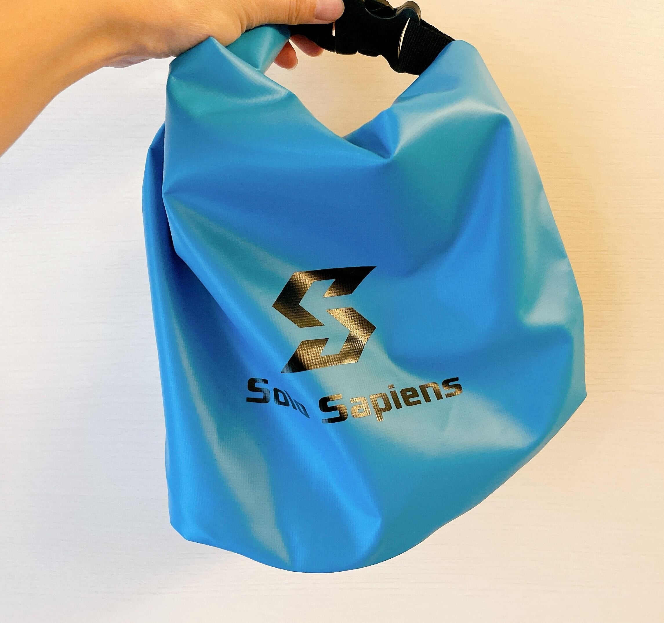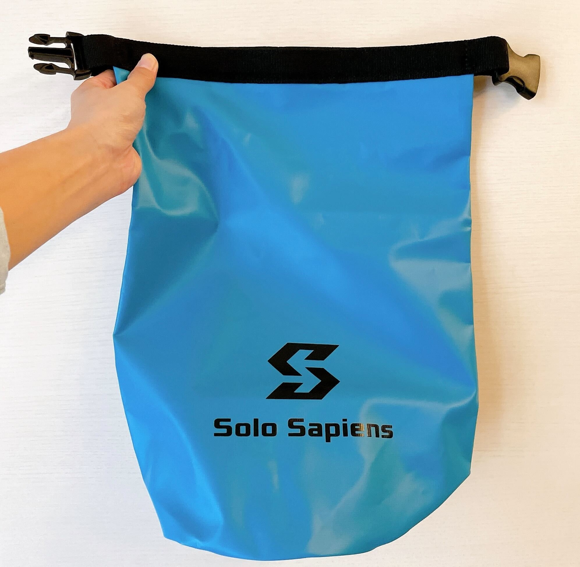 袋の上部には持ち手がついています。開口部を3回ほど巻いて折り、バックルを留めます