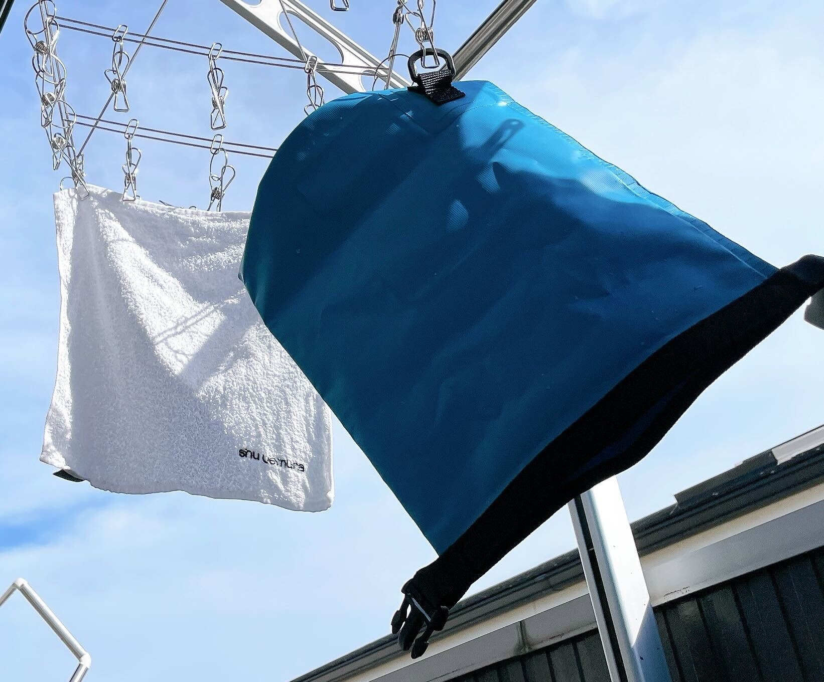 干します。洗濯バッグにリングがあるから洗濯バサミやS字フックにひっかけられます
