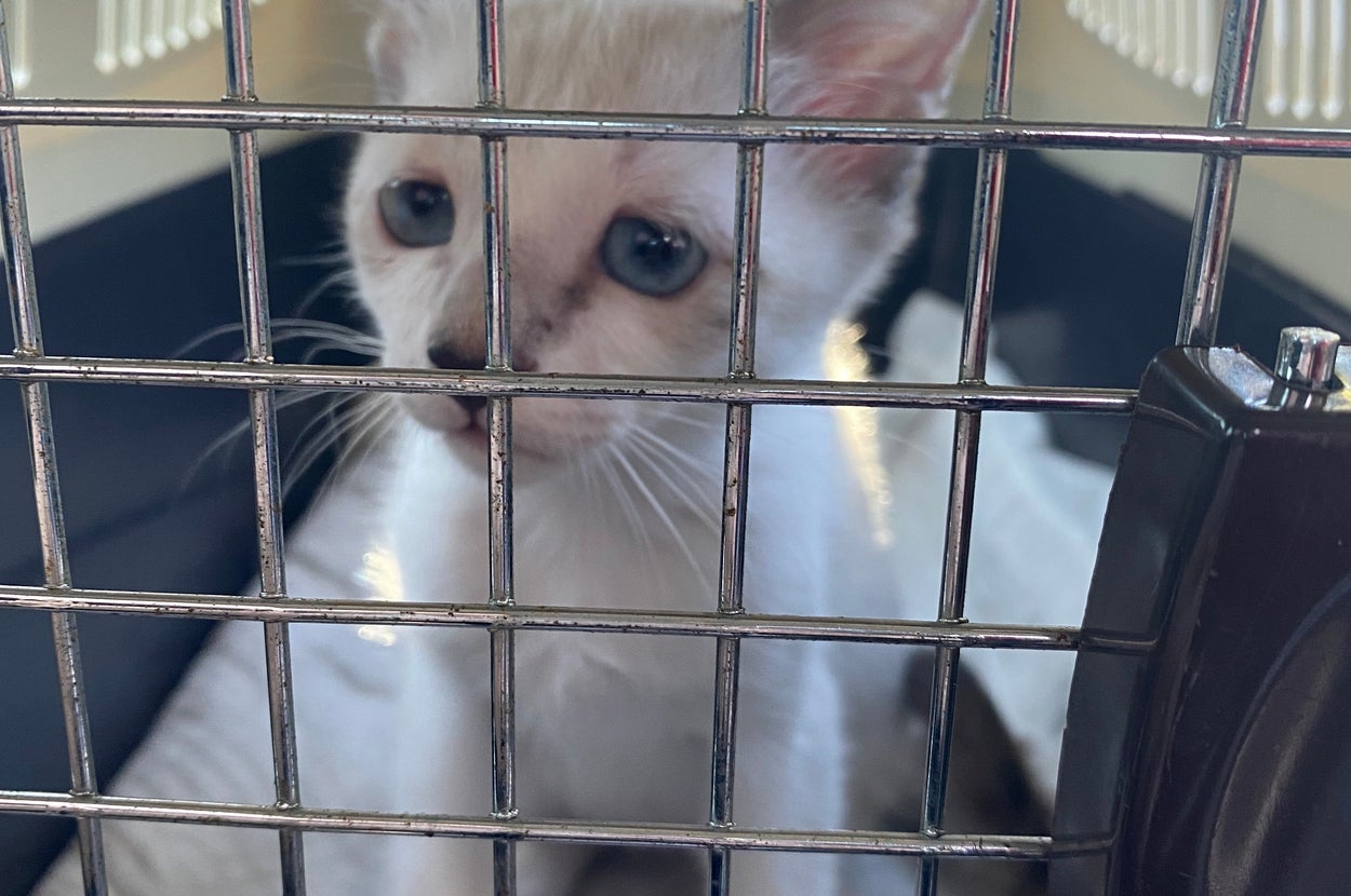 写真に写っているのは、元保護猫の「ミント」ちゃん。生後3カ月のお迎え当時は、ケージの中で訴えるような悲しい表情を見せています。