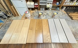「オスモカラー塗装フローリングとDEESAWATモザイクフローリングはアルブルインク」 大手フローリング輸入商社さんから塗装仕上げサンプル作成依頼を戴き、Sグレードの長さ500mmならユニフローリングが9枚届きました。 指定色は人気色アルブルインク調合A色(シオンU-OILハード)、定番色チーク色(オスモカラーウッドワックス#3166)、人気色シルクグレー色(オスモカラーウッドワックス#3119)の3 色です。 しっかり乾燥養生、明日15日にオスモカラーフロアークリアー#3062艶消しで仕上げ塗…