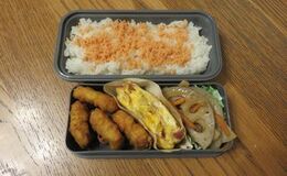 お弁当を紹介します🎶 月曜日 チキンナゲット、玉ねぎ&ベーコンのオムレツ、 れんこんきんぴら tontonのお弁当 meicaのお弁当 火曜日 回鍋肉、ほうれん草ナムル、中華風玉子焼き 胡麻団子 tontonのお弁当 meicanのお弁当 水曜日 具だくさん豚汁、おにぎり(鮭、わかめ) tontonのお弁当 今季初スープジャーです❗ 先週からtontonにそろそろスープジャーを…と 催促されていたのですが、やっと作りました😀 温かくて美味しかったそうです✨ meicaのお弁当 meicaのおにぎ…