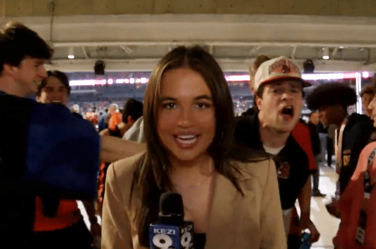 アメリカンフットボールの試合を中継していた女性記者が、ファンに絡まれる映像が拡散されている。妨害を受けるなか、冷静に報道を続ける記者に称賛が寄せられている。