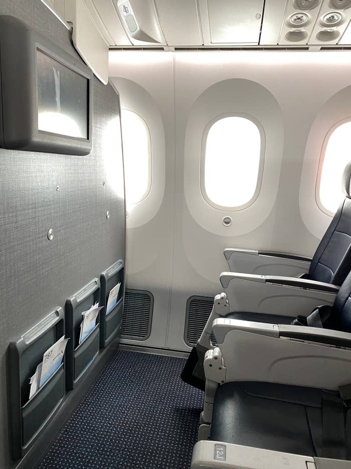 中央ブロックのバルクヘッド席(=前が座席ではなく仕切り壁になっていて、足元が広い席)に座る乗客を撮影した写真。周囲の目もはばからず、裸足を壁に押し付けて座る様子が写っている。