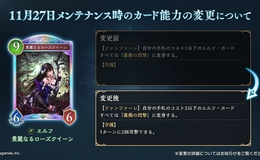 バランス調整のためのカード能力変更が決定しました。11月27日のメンテナンス後から適用されます。 今期は【エルフ】が目立った活躍をしていなかったのでエルフクラスのカードが3枚上方修正されました。 それぞれ能力変更するカードを見ての感想を綴ります。