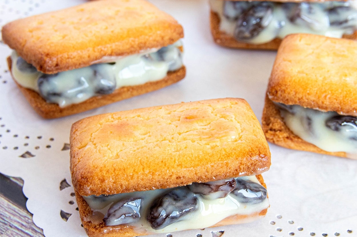 クッキーの間にレーズンとクリームが挟まれた菓子がレース模様のペーパーの上に置かれている。
