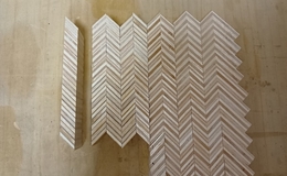 【作業継続】 前回は中途半端な所で終わってしまいました。 今回は、カットしたパーツを更に半分にカットして小物入れの 「蓋」として使用出来る様に加工していきたいと思います。 【問題発生】 この治具は便利です 前回と同じ治具で固定してカットしていきます。 すると・・・ 大破しました やはり接着している面に対して強度が足りません。 バラバラに大破しました。 なので、1/2へのカットは中止です。 残りのパーツを接着して最終ゴールの変更です。 接着と固定 さて、ゴールは何処になるのか? 試作品であり「練習…