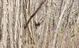 根雪の時期が近づき、好きな景色は、今年の見納め! 昨日は、隣の街の『公園』を歩いてきました。 広場から、お気に入りの『活火山』を眺めると この夏、歩いてきた登山道に沿って、雪の筋が 観えました。3週間前は、真紅の紅葉の真っ盛りでしたが、 すっかり葉が散って、殺風景になりました…😖でも、見晴らしが良くなって、散策路のあちら こちらから『沼』を観ることができました…😁今回は、いつもと逆周りをして、東の展望台に 向かう途中で、『リス』に出遭いました。 茶色から灰色の毛並みへと、すっかり衣替えを してい…