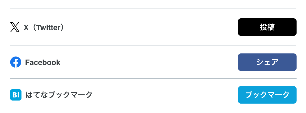 - 記事にソーシャルパーツを設置すると、読み手が簡単に記事をシェアできるようになります(初期設定で設置されています)。