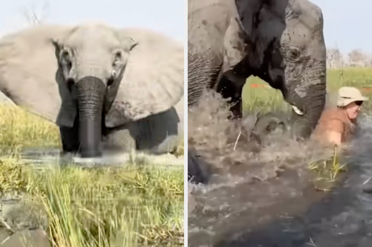 アフリカでサファリツアーに参加した観光客がゾウに襲われた。カヌーを突き飛ばし、女性に攻撃する瞬間が映されている。