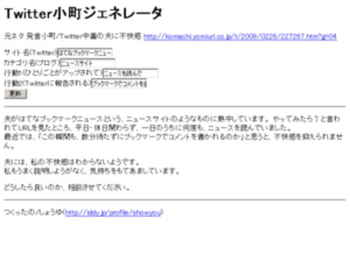 つぶやきを投稿し合うコミュニケーションサイト「Twitter」で、夫が実生活の出来事を何度も報告することに対して不快感を抱く妻が相談している掲示板の書き込みが盛り上がっているのですが、それをベースにして同じタッチの文章を作ることができるジェネレー…