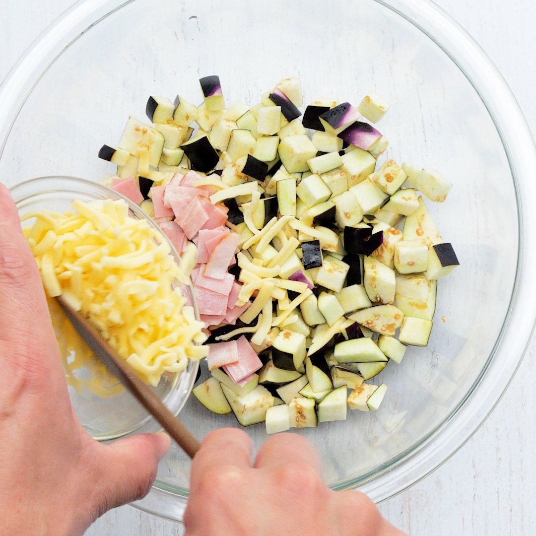 ① なすとベーコンは1cm角に切ってボウルに入れ、【A】を加えて混ぜる。