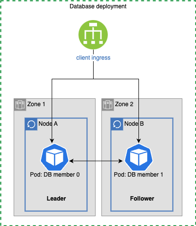 PostgreSQL example: A leader pod and its persistent volume are hosted in one availability zone, while a replica pod and its persistent volume are located in another zone.
